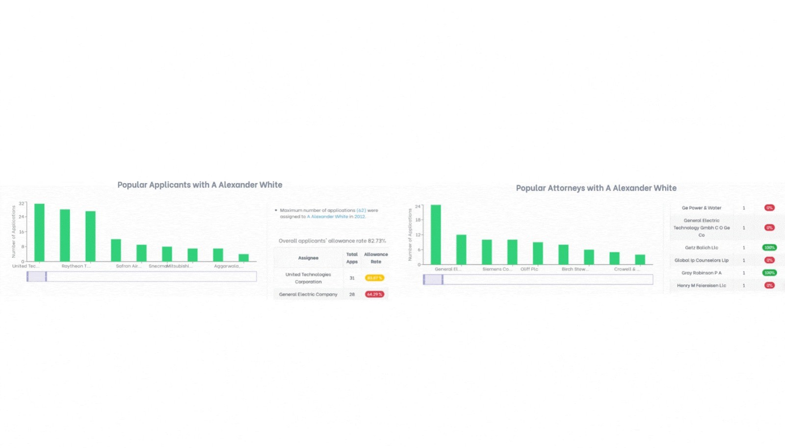 See which companies and attorneys most often face your examiner and how they perform. This context shows whether your examiner is tough across the board or more lenient with certain filers, helping you set expectations and shape your approach with better insight.