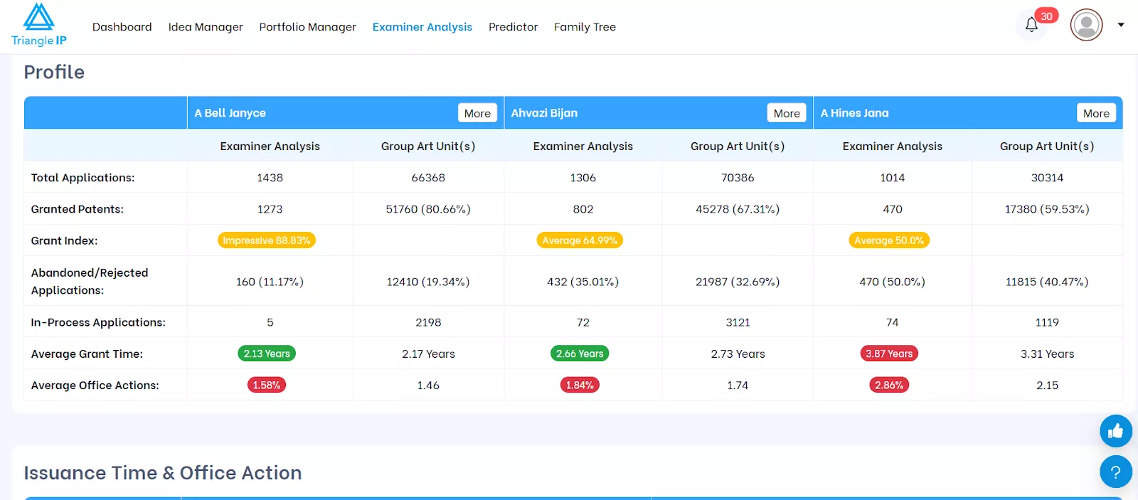 Acing a patent examiner interview comes down to three things: preparation, timing, and understanding your examiner’s behavior. Before the interview, use tools like the Examiner Analysis feature in Triangle IP’s TIP Tool™ to review data such as: