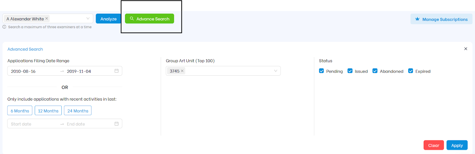 With Advanced Search, you control the view. Set filing or grant date ranges, limit to recent activity, focus on specific Group Art Units, or filter by case status.