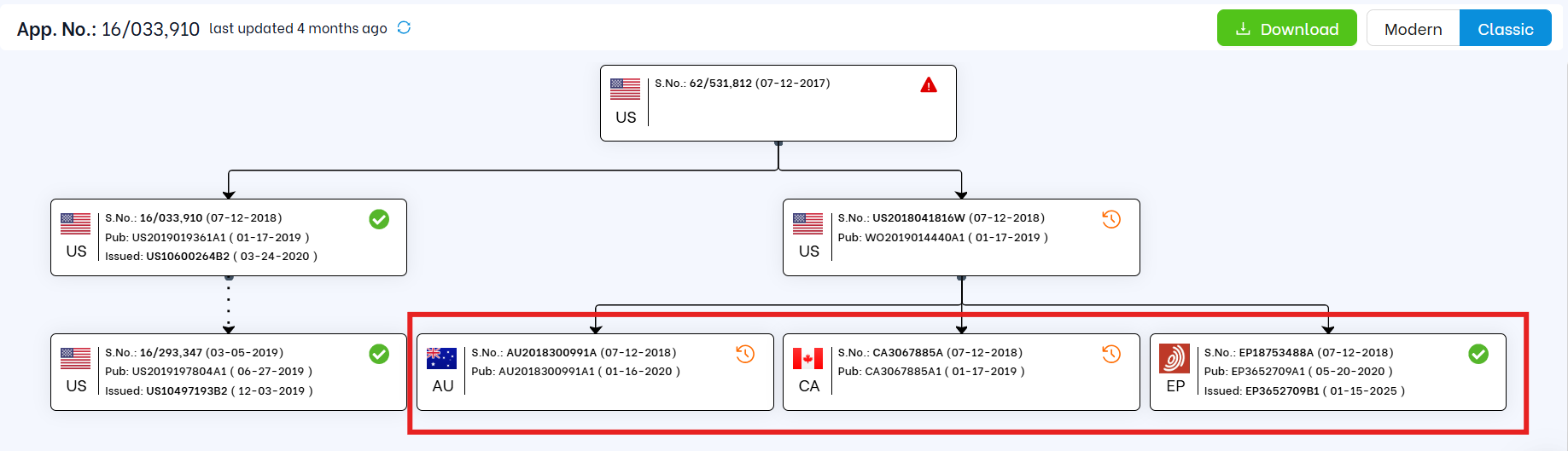View both U.S.-based and international patent family members, including private PAIR data. Country flags help you quickly grasp the global landscape of your patent portfolio.